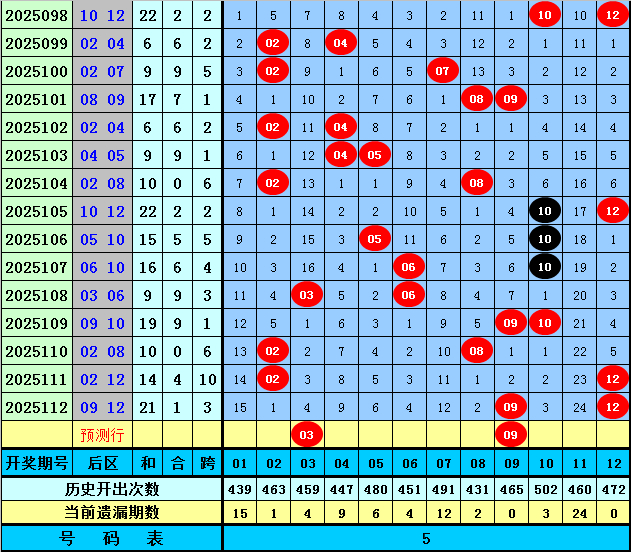 后区分析【一区01-04,二区05-08,三区09-12】:上期后区奖号为09和12,全部出现在第三区,近50期后区三区比为37:28:35,近10期三区比为5:6:9,本期注意第一、三区号码出现,关注两码03+09。